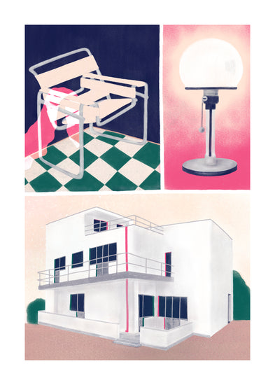 Infuse your interior space with the "Bauhaus" by Frauke Schyroki. This stunning illustration is made from a range of patterns and structures, combined using digital drawing to create a unique collage of iconic Bauhaus designs. The bold colors in the poster will bring vibrancy to any space, making your wall come to life!