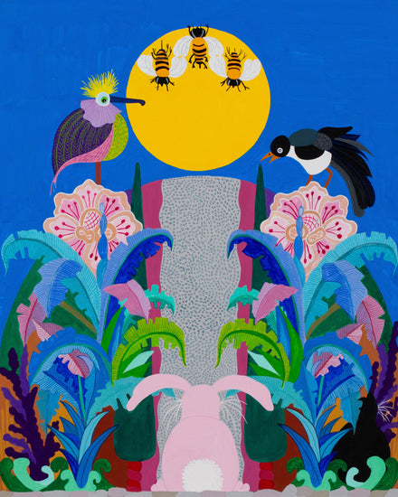 Jean painted this illustration for her children’s book, “Bettina Creates a Garden,” because an image was needed to portray Bettina the Rabbit looking toward the entrance of her botanical garden. What developed was the creation of a distinct symmetrical design combined with all the joy and playfulness of an illustration. Jean’s love of symmetry was inspired by the Italian Renaissance painter Piero della Francesca who creatively blended perspective and geometry when painting architecture, landscapes and people. His particular use of symmetry often added a touch of humour and lightness to rather serious paintings and frescoes. In this painting Jean combines, alongside her much-loved symmetry, other passions including her interpretation of a bird of paradise [in the left-hand corner], Bettina, bees and her black cat, as usual hidden in the foliage.