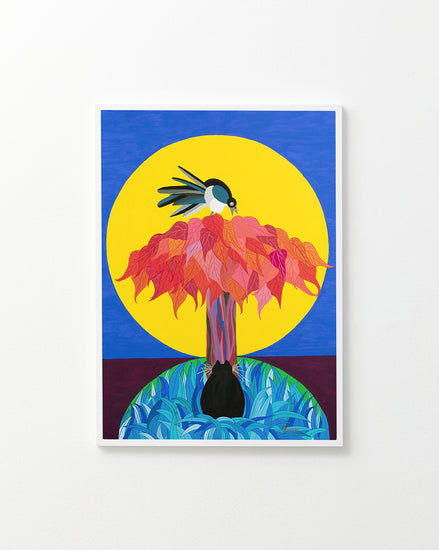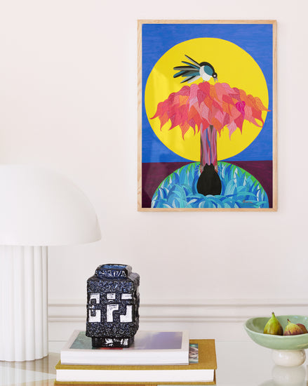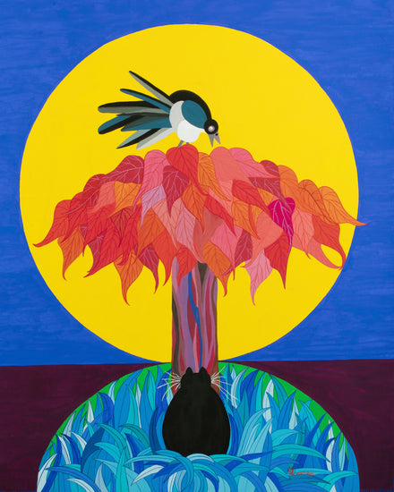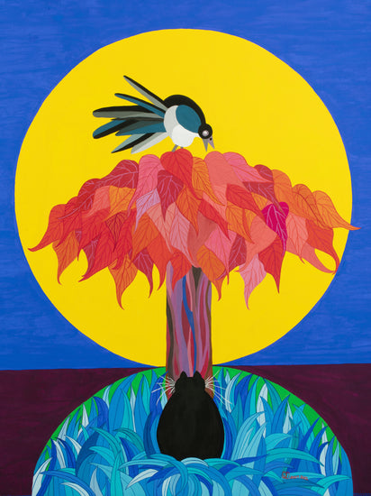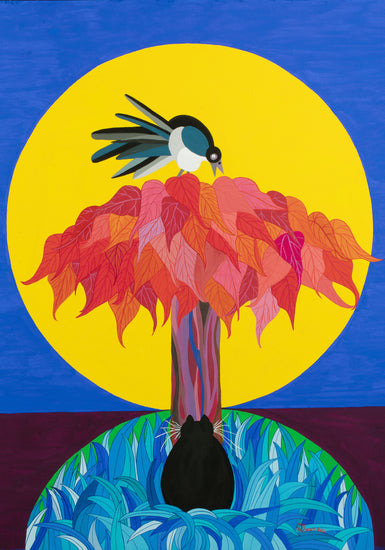 While painting her last children’s book, “Bettina Creates a Garden,” Jean incorporated this black cat in many of the illustrations, and so was then inspired for her iconic feline to have its own painting, watching a magpie – another of Jean’s classic designs. Jean also loved the idea of a graphic visual of the sun as a circle in the middle balanced out with the half circle style mound below, combining vivid colours such as the blue grass and leaves in all shades of pinks and reds. It was autumn when Jean painted this and her Umbrian garden’s colour palate also added to her inspiration. Although this painting wasn’t originally going to be in the children’s book, it was eventually worked into the story so as to include Jean’s distinctive design element, vibrant colours and of course, the wonderful cat!