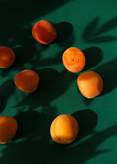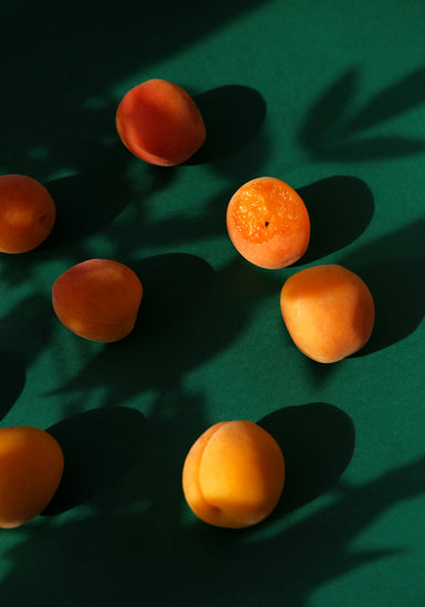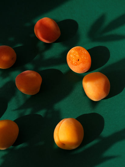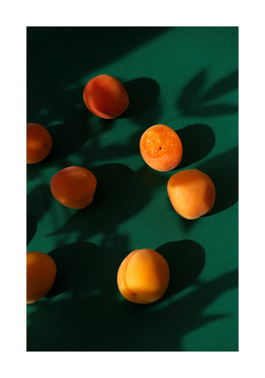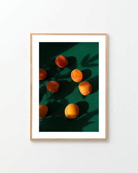 “In the evening sun” is a poster that captures the essence of summer. Yellow and orange peaches on a dark green background shot in the beautiful evening sun in Sofie’s garden. This poster showcases a perfect color contrast that will add a vibrant look to your walls.