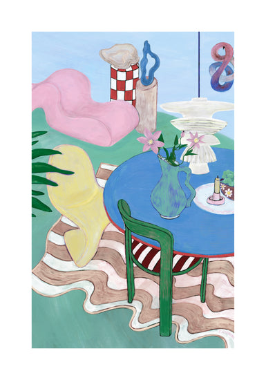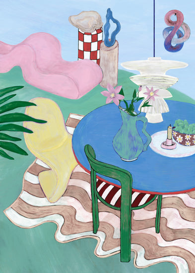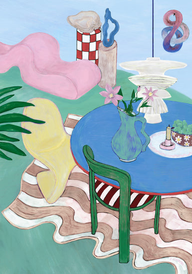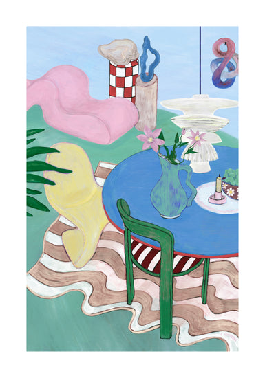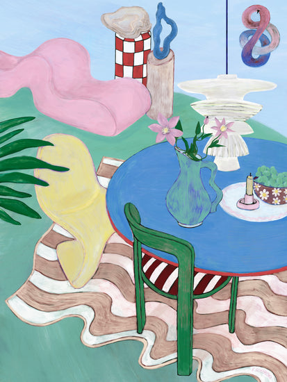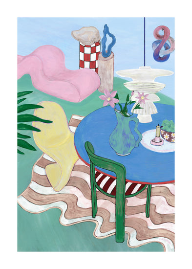 Frauke’s idea with this piece was to introduce her favorite motif—the living room—to viewers in the hopes of inspiring them to create a space they love. It isn’t about impressing visitors; it’s about giving yourself some well-deserved time off and reflecting who you are through your interior choices. Frauke has combined scanned patterns and structures with digital drawing in her work to create an intriguing living room of stunning furniture pieces, including Hay's Rey chair and Vitra's Panton chair.