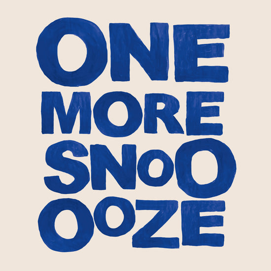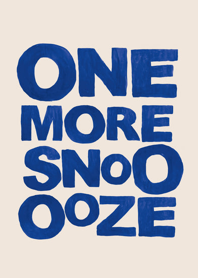 Poster with hand-painted text in blue saying "One more snooooze" against an off-white background.