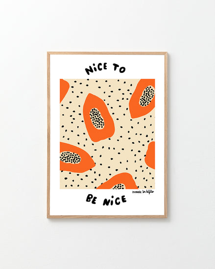 This vibrant illustration features halved papayas on a beige background and the text "Nice to be Nice." Ideal for your children's rooms with their colorful, playful design and positive message.