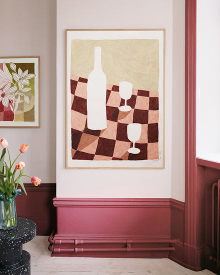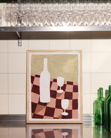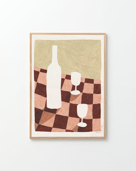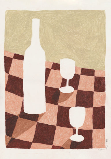 This stunning poster is made with colored pencils in Anouk Van Cleef's tiny studio I Rotterdam, The Netherlands. It wonderfully depicts a chequered table cloth with a wine bottle and glasses on, making it ideal for any wall space in your kitchen or wine bar.