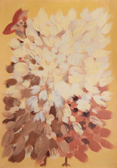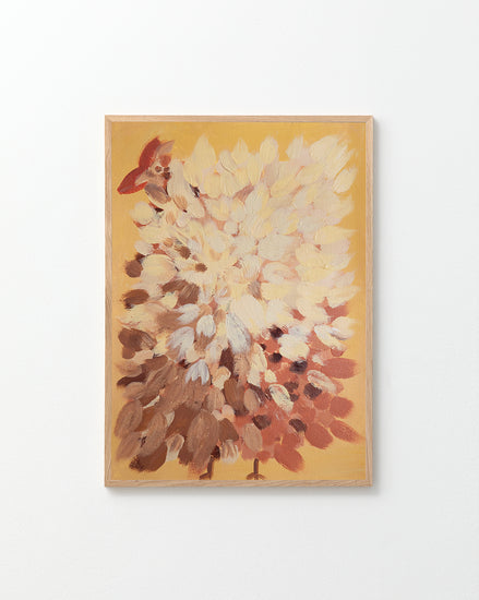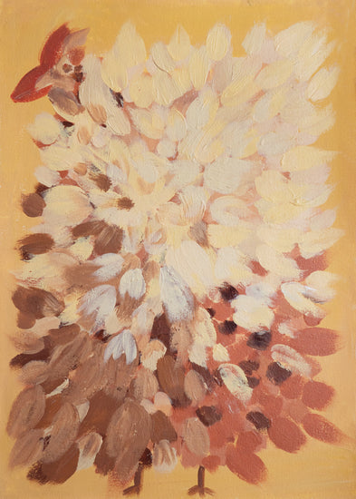 The picture portrays an abstractly painted chicken. The background is in yellow, while the subject and feathers are light yellow, brown, and red. The original artwork is painted with acrylic on canvas paper. The print is suits both in the living room and the children's room.