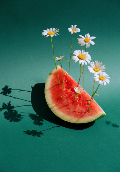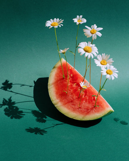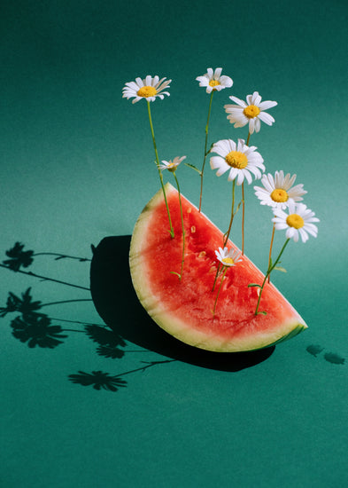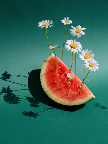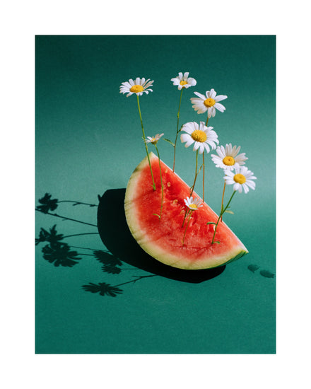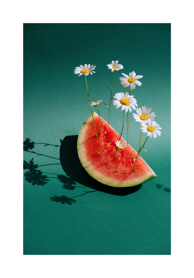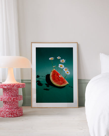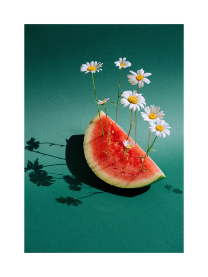 This poster was shot on a sunny day outside of Sofie Sund’s house. She had the idea to combine two different elements that reminded her of summer and make an artwork out of it. She decided to make a whimsical little sculpture out of a watermelon and daisies, and as she photographed it, the happy flowers danced in the summer breeze.