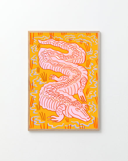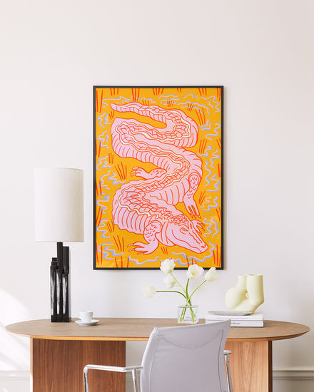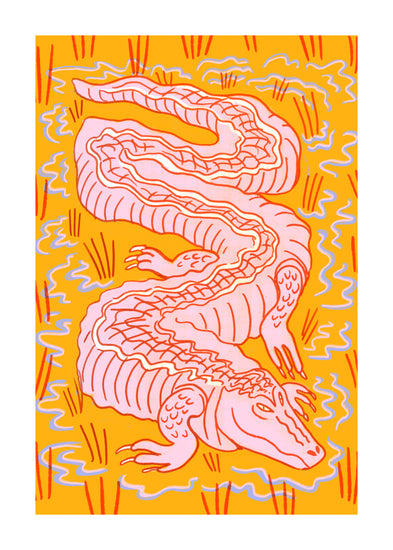 Let us introduce you to "Take Up Space": an eye-catching illustration perfect for modern home décor. Art work by the talented Liv Bishop, this poster depicts a friendly pink crocodile slithering through an orange swamp.