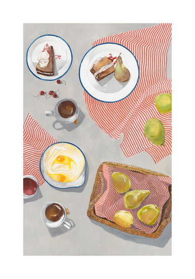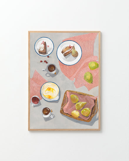 Imagine a peaceful moment spent with a dear friend or beloved over a cup of tea and pastry. This beautiful poster brings a little bit of sweetness wherever you choose to hang it.The painting depicts a classic tea time scene of tea cups, cake and fruit on a table top covered in red and white striped cloths. Whether you hang it in your kitchen or in a coffee shop, it's sure to bring the room to life!