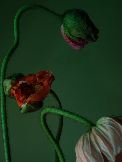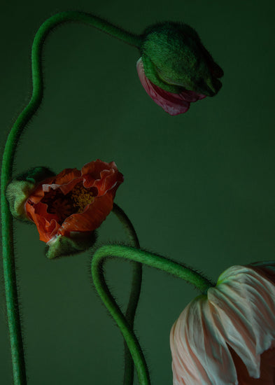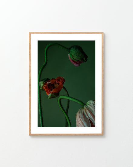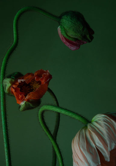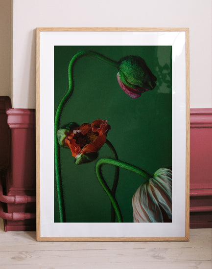 Capture the graceful movement of Icelandic Poppies with this captivating still life photograph by Rowan. The poster features pink, red, and white poppies set against a lush green background. Bring the beauty of nature into your space with this exquisite artwork.