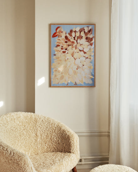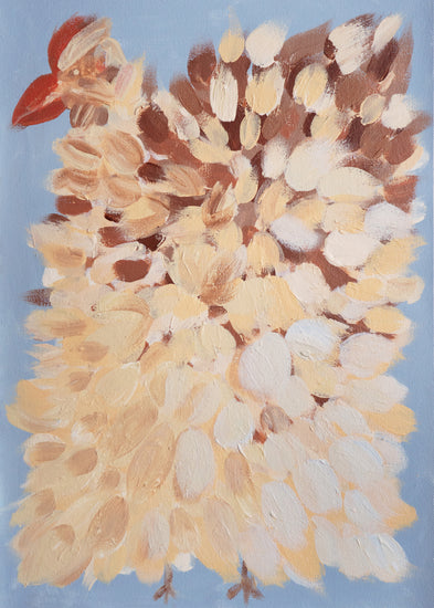 The picture portrays an abstractly painted chicken. The background is in blue, while the subject and feathers are beige, brown, and white. The original artwork is painted with acrylic on canvas paper. The print suits both in the living room and the children's room.