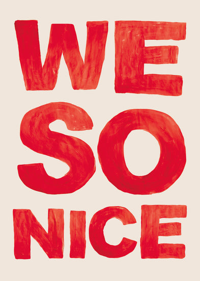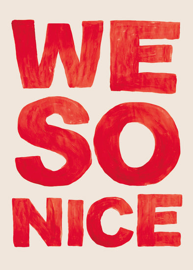 Poster with hand-painted text in red saying "We so nice" against an off-white background.